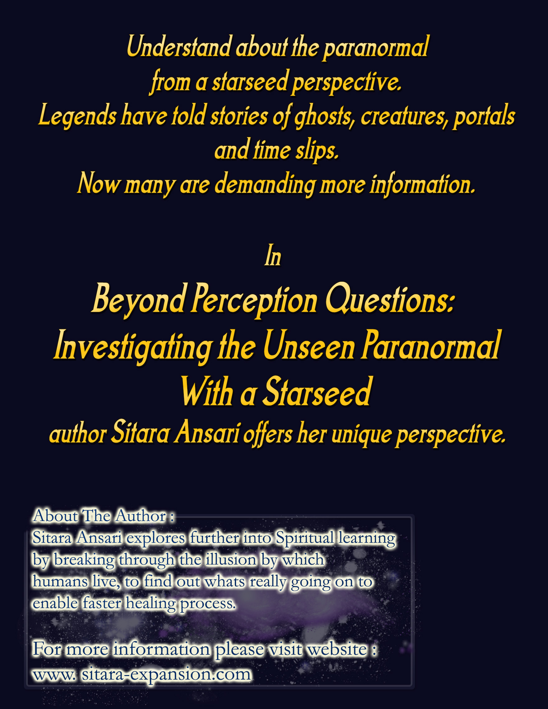 In Beyond Perception Questions: Investigating the Unseen Paranormal With a Starseed, Author and Researcher Sitara Ansari, BA (Hons) offers her unique perspective by answering questions put to her regarding the nature of the paranormal in this Ebook.